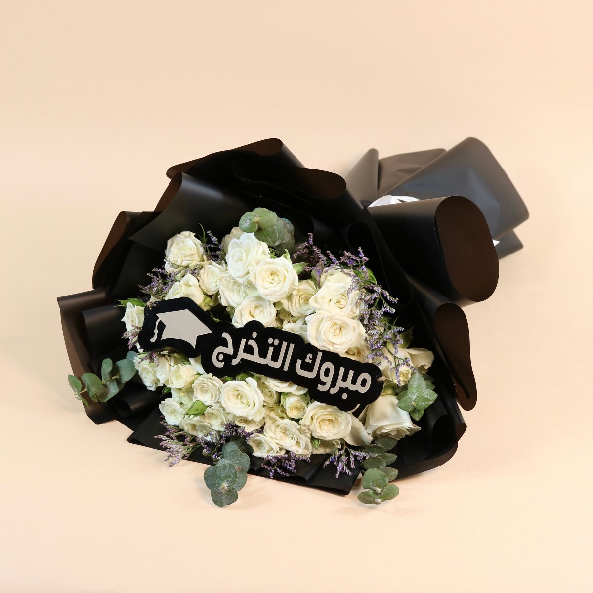 بوكيه ورد لحفل تخرج أبيض بتصميم أنيق يعكس روح الاحتفال والإنجاز يتضمن مجموعة من الأزهار الطازجة والجميلة .